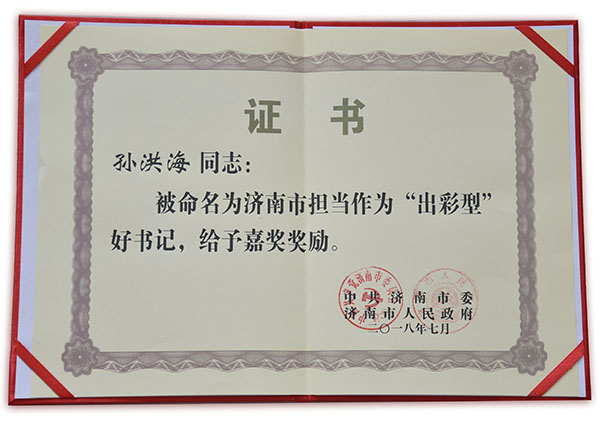 2018年7月1日下午,济南市委在龙奥大厦召开庆祝中国共产党成立97周年暨全市担当作为“出彩型”好干部好团队命名大会。会上孙洪海董事长被命名为济南市担当作为“出彩型”好书记。