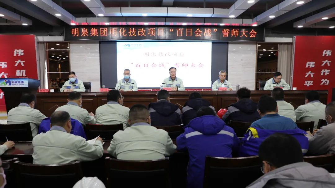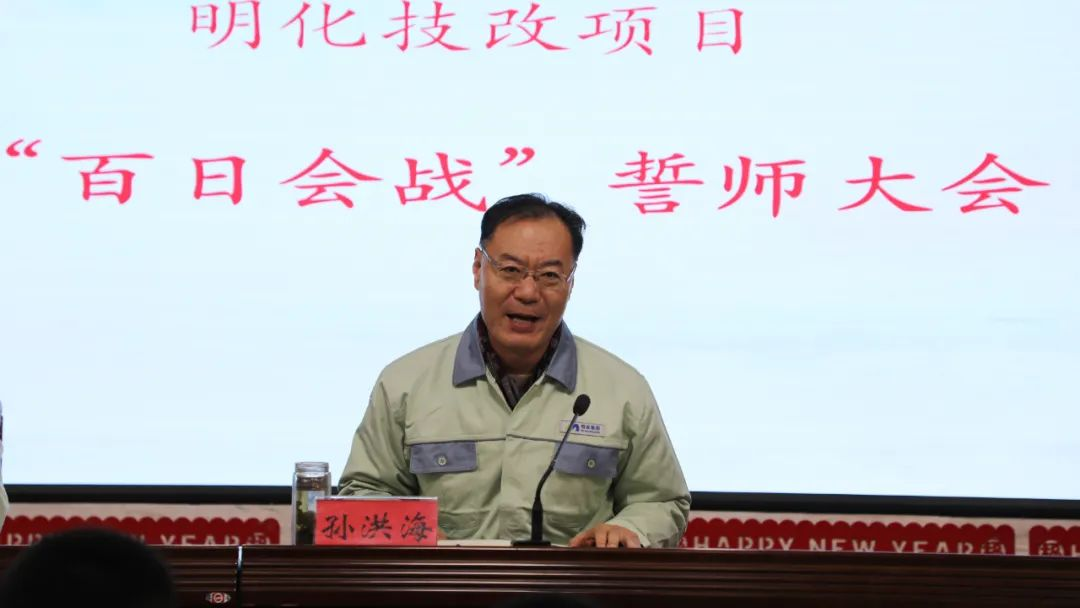 2月20日上午9:00,明化技改项目“百日会战”誓师大会在3号办公楼四楼会议室召开。集团党委书记、董事长孙洪海,总裁孙志田,董事朱卫,安全环保总监、明化技改项目组长张文兵,项目建设部主任、明化技改项目常务副组长张同福,明化公司总经理、明化技改项目开车组组长乔学震,运维公司总经理、明化技改项目安装组组长王晓东,中国化学工程第十三建设有限公司项目经理张玉良,河南省中大工程监理有限公司项目总监王国超,济南宝明气体有限公司总经理何旭坤、项目经理殷长胜,太原锅炉集团有限公司项目经理郎燕飞以及各职能部门主要负责人、明化公司中层以上管理人员、明化技改项目组全体人员、运维公司职工代表、建设单位和监理单位人员,共150余人参加大会。会议由张文兵主持。张玉良、殷长胜、郎燕飞、王晓东、乔学震、张同福等参建单位代表依次作表态发言,均表示将以“百日会战”为契机,以饱满的热情、昂扬的斗志、坚韧的毅力投入到项目建设中去,争分夺秒,攻坚克难,保安全、保质量,确保项目如期建成投产。