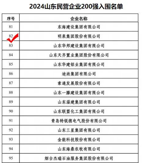 7月26日,由山东省工商联、山东省发展改革委、山东省科技厅、山东省人力资源和社会保障厅、山东省农业农村厅、山东省商务厅、山东省税务局、山东省市场监管局共同发布2024山东民营企业百强系列榜单,88858cc永利位列2024山东民营企业200强第82位。