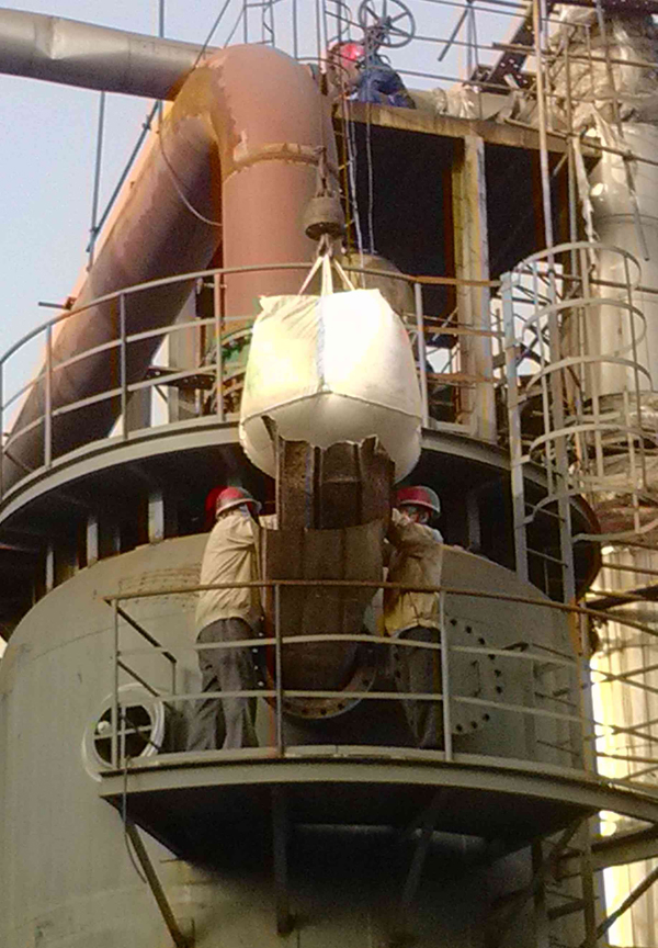 水解剂的装填工作要分层进行,并且在装填时要保证水解剂自由下落的高度不超过0.5米,因此每装填0.5m高的催化剂就需人员进入塔内将催化剂扒平至应装高度。装填初期炉底必须用水解剂将丝网折边贴炉壁压好,不能有卷边现象,以确保水解剂不泄露。