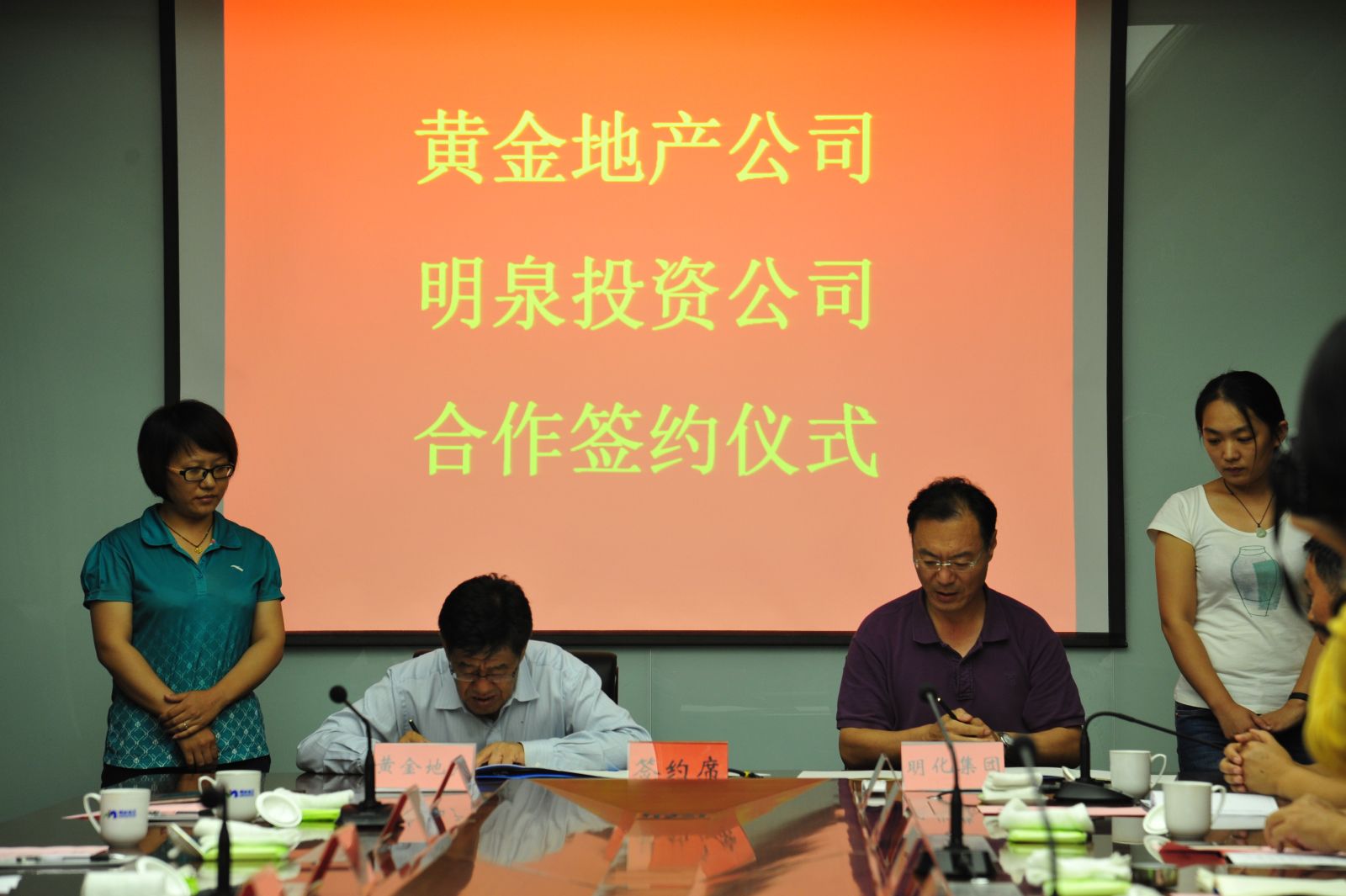 9月21日,山东黄金地产公司与我公司土地项目合作意向签约仪式在MTA项目办公楼五楼会议室举行。黄金集团总经理助理、地产公司党委书记董事长孙秀恩,总经理臧文宁,副总经理相其科、张建刚等人,我公司董事长孙洪海、副总经理彭建军及相关部门负责人出席签约仪式。